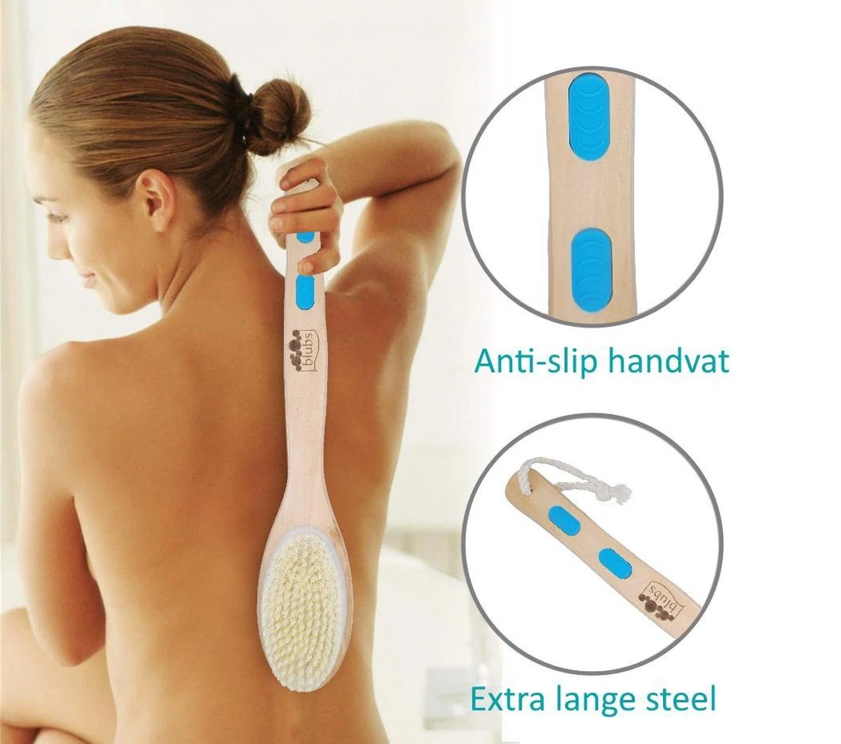 Blubs® – Houten Badborstel – Dry Brush – Rug Scrubber – Lichaamsborstel – Rugborstel Douche Met Steel – Huidborstel – Rugborstel Hout – Houten Badborstel Met Steel – Doucheborstel Met Steel – Houten Borstel – Droogborstel – Massage – Blauw