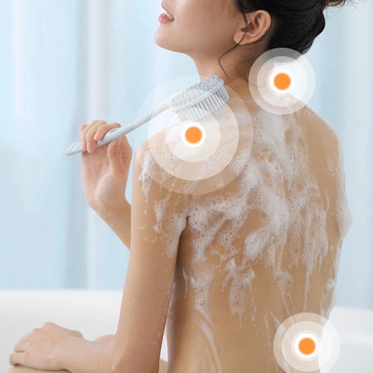 Door de vele siliconen haartjes is het erg makkelijk om veel schuim te creëren. Doe een kleine hoeveelheid douchegel op de natte borstel en wrijf dan met uw hand door de haartjes. Breng de met schuim bedekte borstel naar uw rug of een ander lichaamsdeel.