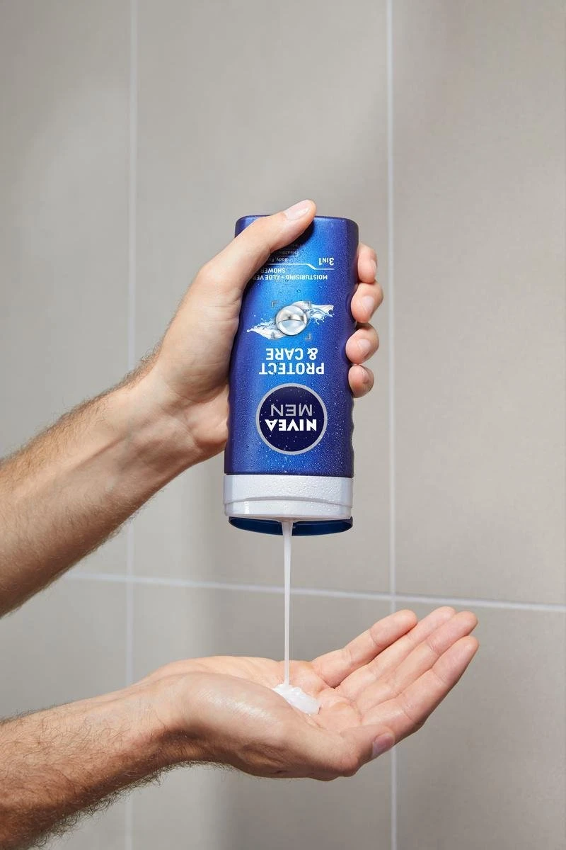 NIVEA MEN Protect & Care douchegel. VOOR MANNEN die een schone en gehydrateerde huid willen na het douchen. De verzorgende formule met Aloë Vera beschermt jouw huid tegen uitdroging. De 3-in-1 douchegel voor lichaam, gezicht en haar is de beste manier om je huid goed te verzorgen en het te beschermen tegen uitdroging. Het zorgt voor een intensieve verzorging en bescherming tegen uitdroging – voor een gezond uitziende huid.