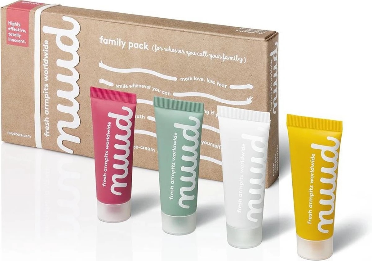 Met de Family Pack haal je nuud in huis voor je hele familie. Of voor jou en nog drie huisgenoten. Of voor jou en je vrienden, collega’s, teamgenoten; kortom, mensen die jij familie noemt. Vier tubes in vier verschillende kleuren, zodat iedereen weet welke tube nuud van wie is. 42% voordeliger dan een Starter Pack! En dus eigenlijk nóg slimmer dan nuud’s Smarter Pack.
