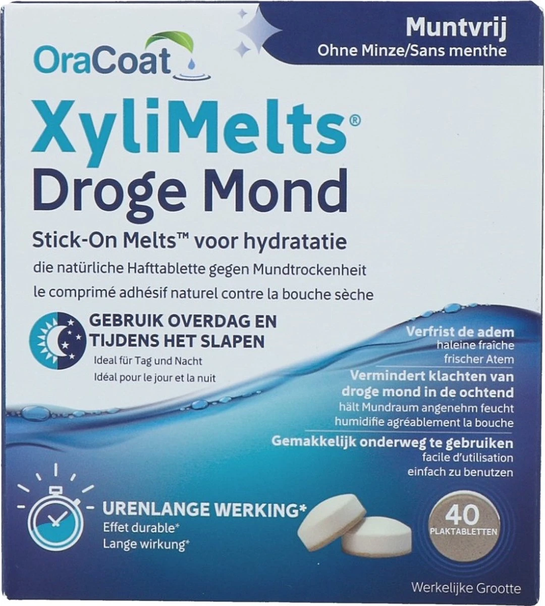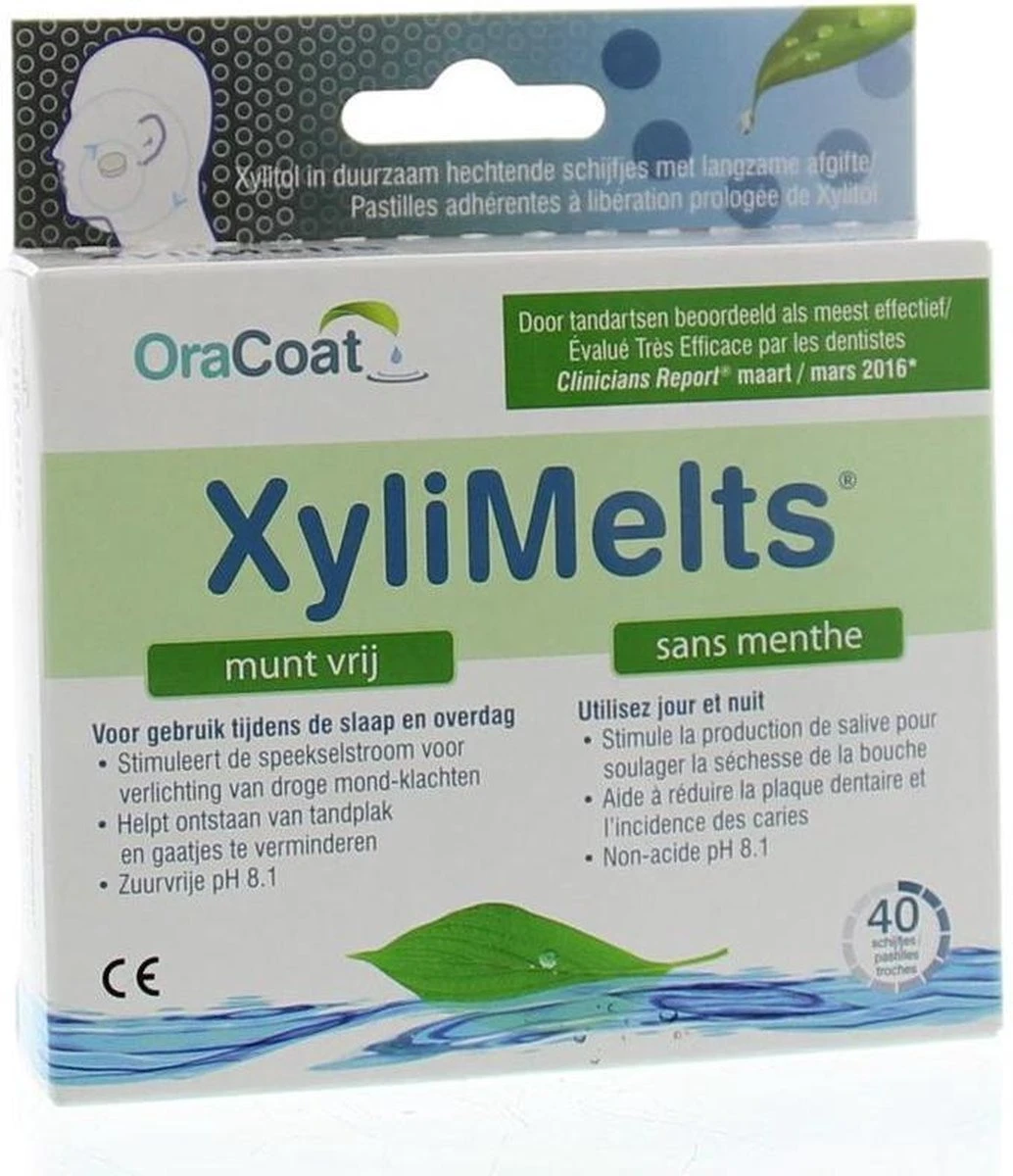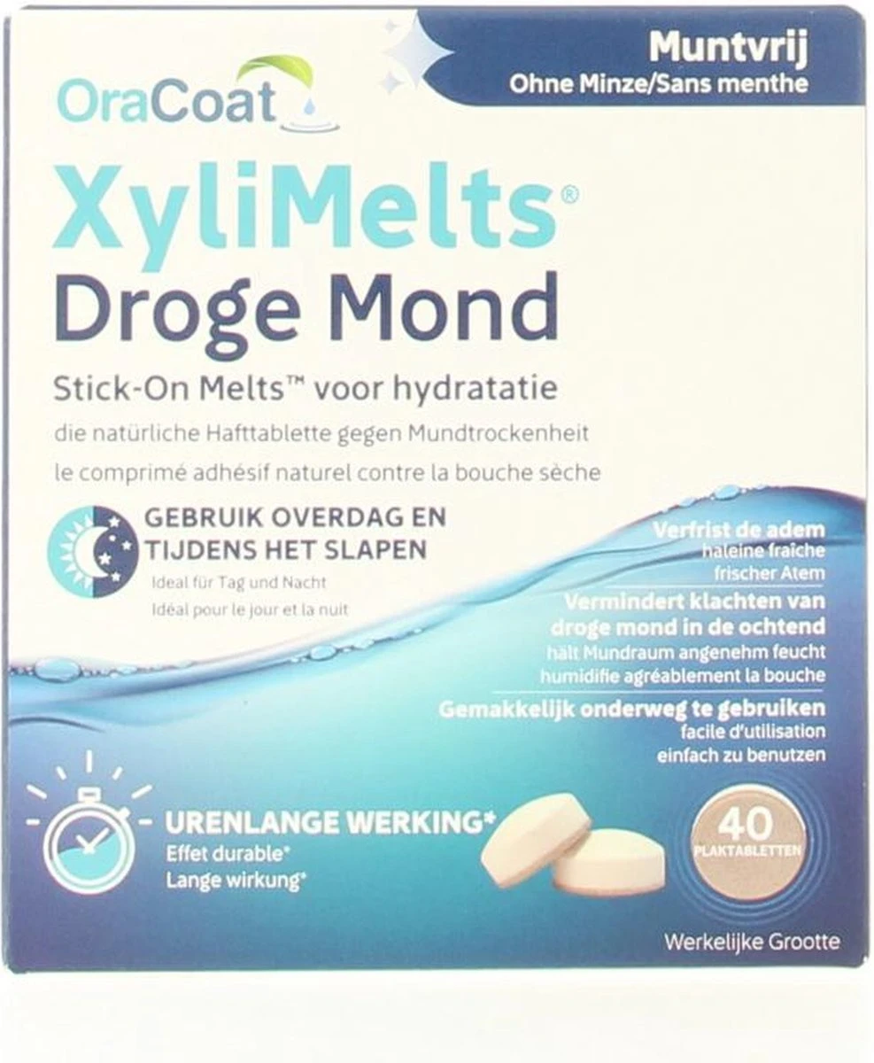 Xylimelts munt vrij zijn plakkende tabletten met Xylitol en cellulose. Deze bestanddelen lossen langzaam op in de mond en stimuleren de aanmaak van speeksel. De tablet geeft daardoor urenlang een vochtige, kalmerende en stimulerende speekselvloed. Daardoor blijft de mond vochtig.